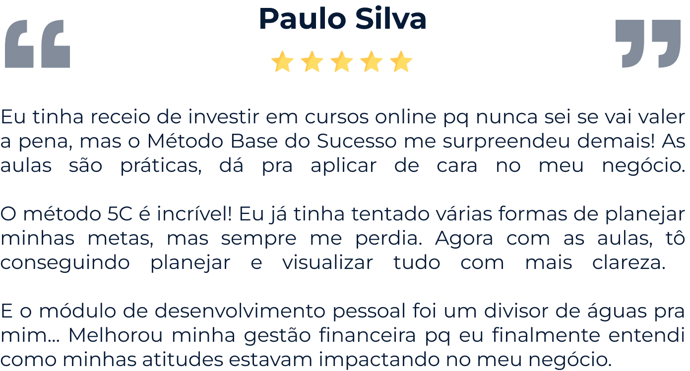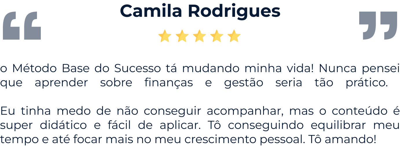 Os resultados podem variar dependendo do seu empenho em aplicar as estratégias, mas muitos participantes relatam mudanças significativas em suas finanças e gestão em poucas semanas. O Método Base do Sucesso foi criado para trazer resultados reais a curto e longo prazo.
